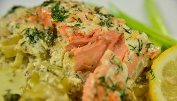 Soczysty łosoś w porach to łatwe i szybkie w przygotowaniu danie. Ostrość pora idealnie współgra z delikatnym mięsem ryby. Łososia można podać tradycyjnie z ziemniakami lub wybranym sosem.