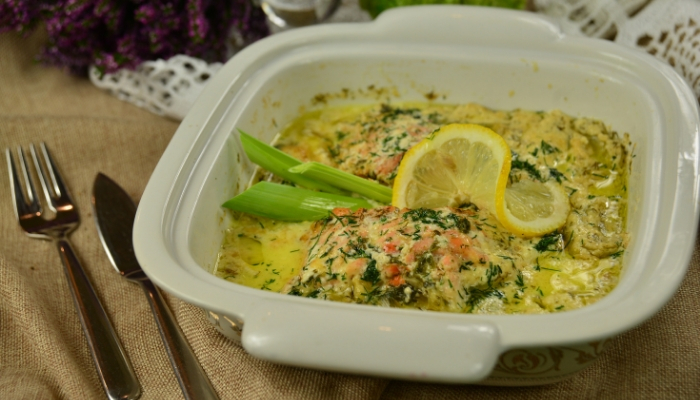 Por umyć, pokroić w plastry i włożyć do naczynia żaroodpornego. Na to ułożyć łososia, całość posolić, oprószyć pieprzem i czosnkiem. W misce zrobić zacierkę ze śmietany i koperku. Całość zalać zacierką i piec w piekarniku pod przykryciem ok. 45 minut.