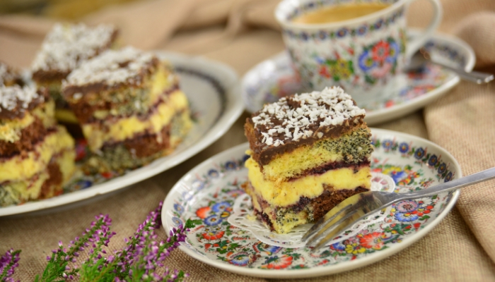 Kakaowo-makowo-kokosowy biszkopt przełożony kremem budyniowym i dżemem porzeczkowym. Mimo swojej nazwy ciasto jest delikatne i bardzo smaczne, a samo przygotowanie bardzo proste.