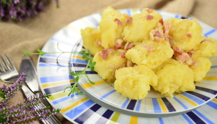 Syta potrawa z podsmażanych ziemniaków, cebuli i boczku. Tradycyjne śląskie danie przygotowywane na ogniu w żeliwnym kociołku prezentujemy w wydaniu domowym.