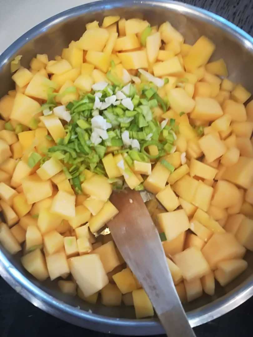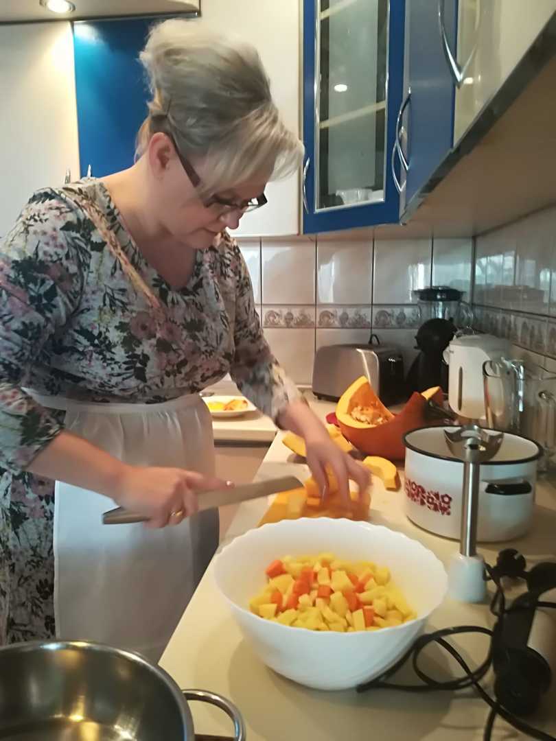 Dynię obrać ze skórki, usunąć nasiona, miąższ pokroić w kostkę. Ziemniaki, marchewkę obrać i pokroić w kostkę, następnie pokroić por i czosnek.