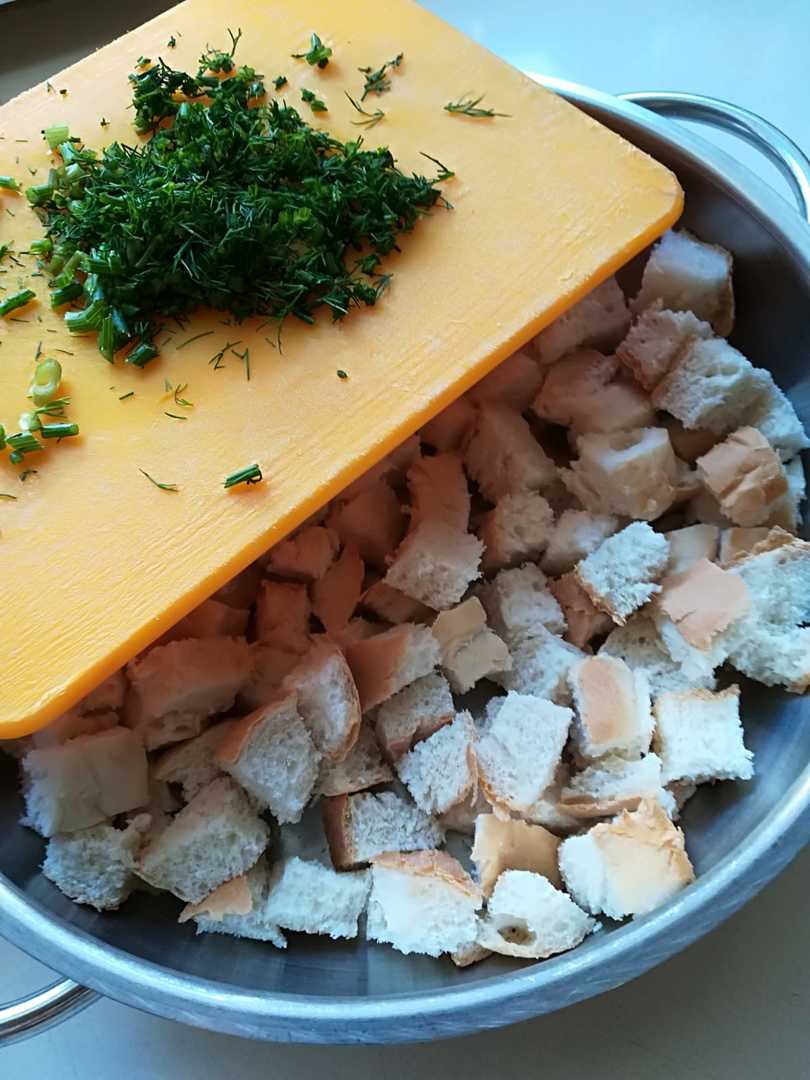 Bułkę pokrojoną w kostkę wrzucamy na roztopione na patelni masło z czosnkiem.