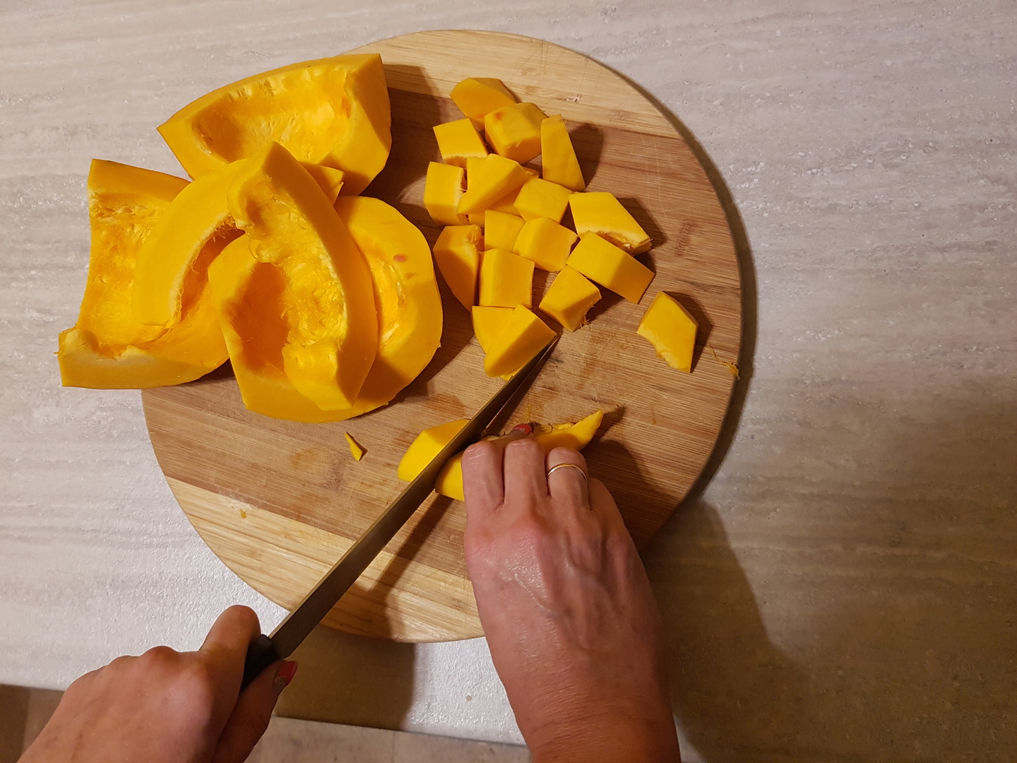 Dynię obieramy ze skórki, kroimy w kostkę, przekładamy do rondla i dodajemy pozostałe składniki. Cukier dodajemy w dwóch porcjach, żeby powidła nie były zbyt słodkie. Powidła smażymy, aż dynia się rozpadnie, następnie zmniejszamy ogień i powoli je prażymy.